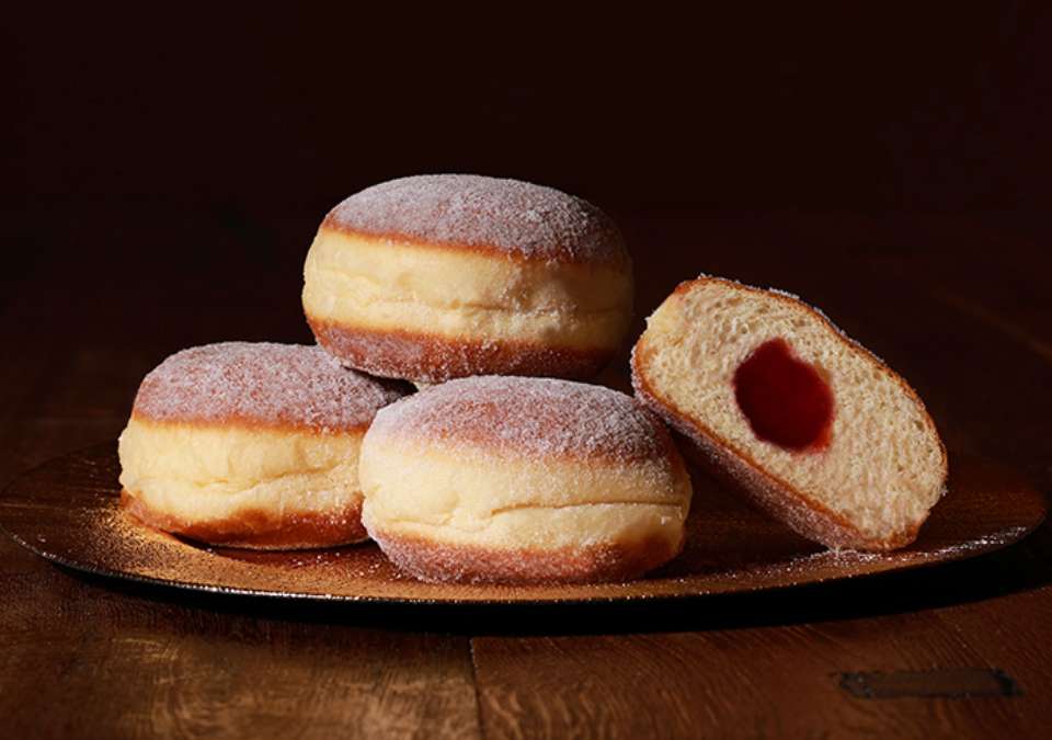 lockerer Hefeteig, in Öl gebacken, gefüllt mit einer leckeren Mehrfruchtkonfitüre aus Himbeeren, Sauerkirschen, Äpfeln und Erdbeeren