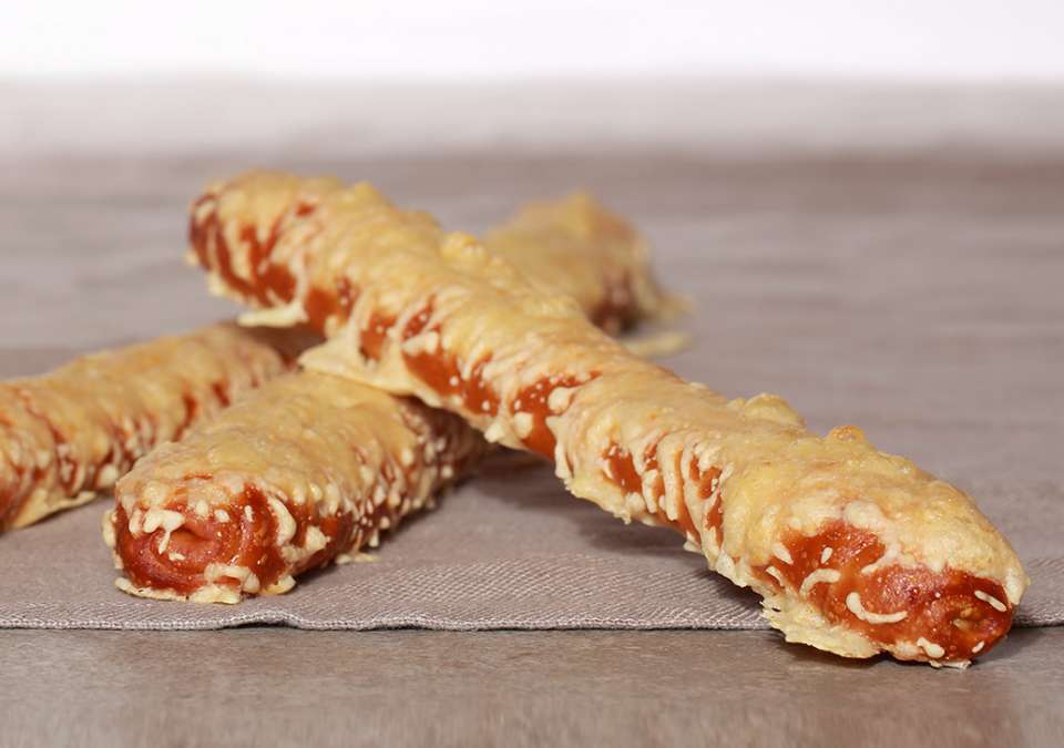 dünn ausgezogene Laugenstange mit geriebenem Emmentaler Käse überbacken, vegetarisch