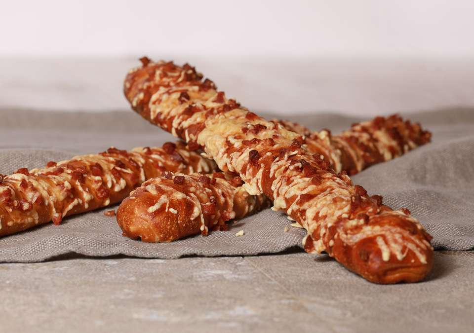 dünn ausgezogene Laugenstange in Käse gewälzt und mit Baconwürfeln belegt